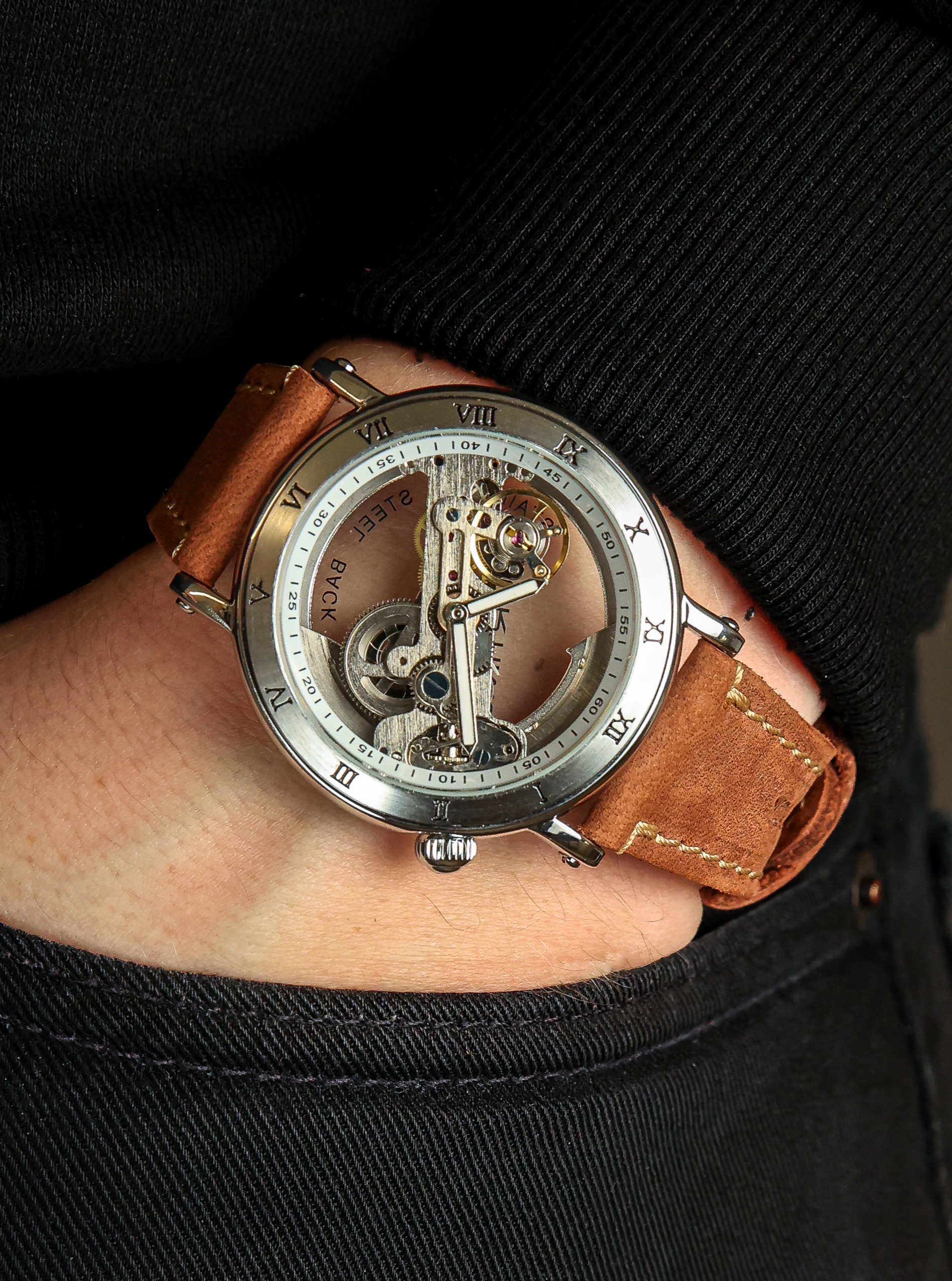 Эти часы – настоящее произведение мастерства. Их механизм, выполненный в классическом стиле, позволяет увидеть все внутренние детали, благодаря прозрачному циферблату. Серебряный цвет металлического корпуса, белый цвет циферблата и ремешок из натуральной кожи прекрасно сочетаются и подчеркивают элегантность этих часов.